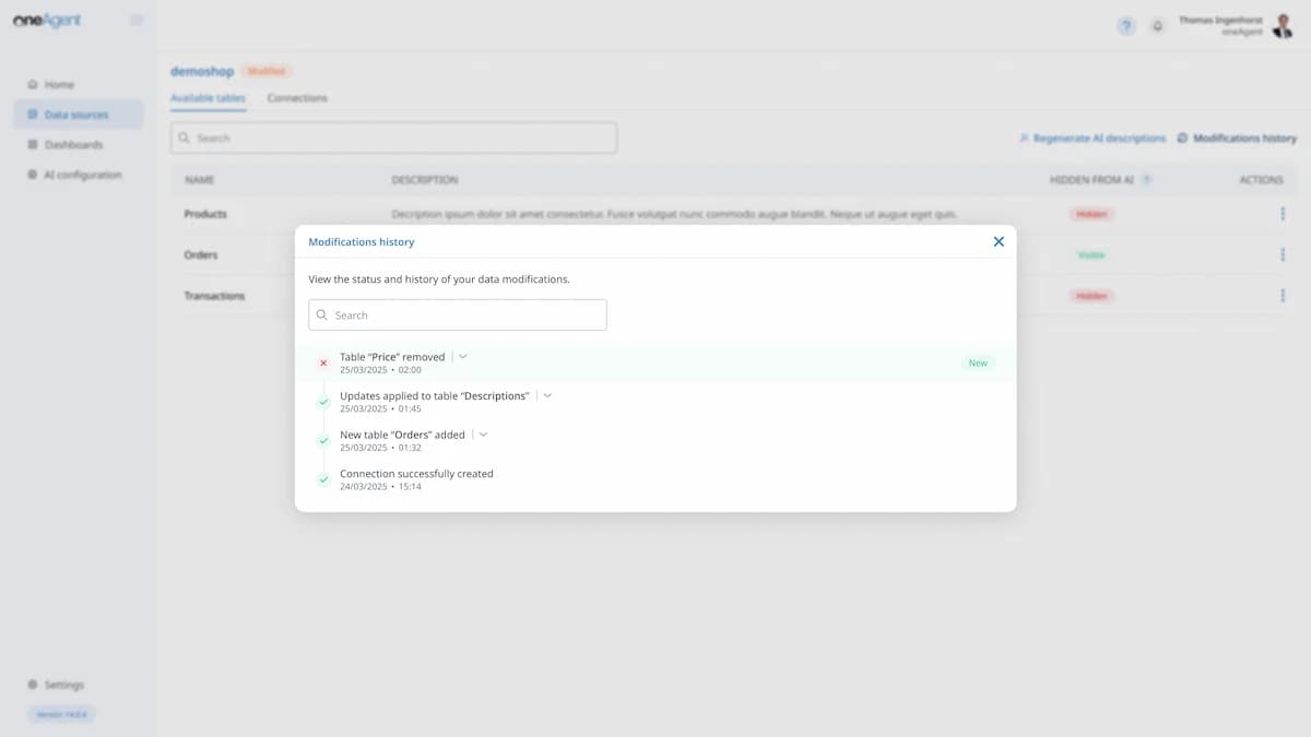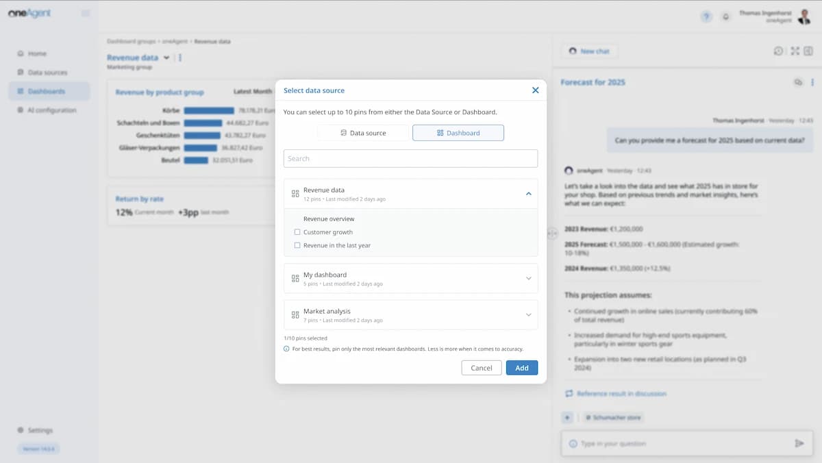 Yes. oneAgent optimally complements your existing BI landscape. While traditional BI tools like Power BI or Tableau often rely on prepared data, oneAgent directly accesses the source systems. This way, you get answers in natural language – quickly, flexibly, and without detours through additional data models. Directly from the single point of truth.