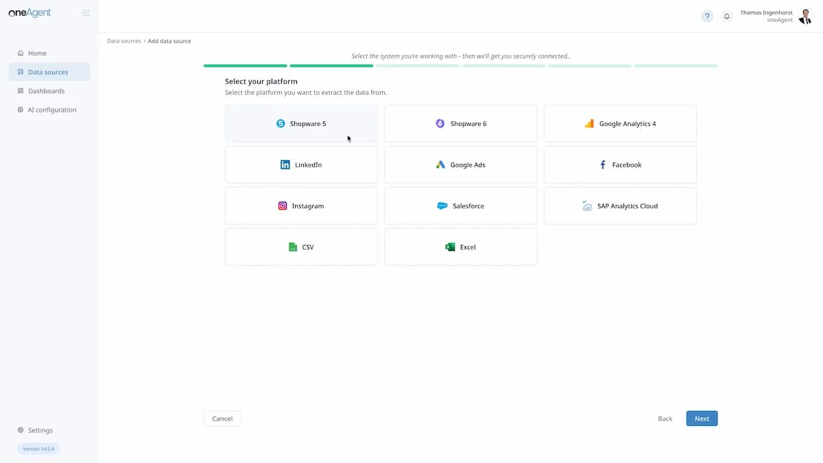 Plug in Shopify, Shopware, Amazon or any other system with a single click. oneAgent instantly understands your sales, inventory, and customer behavior.